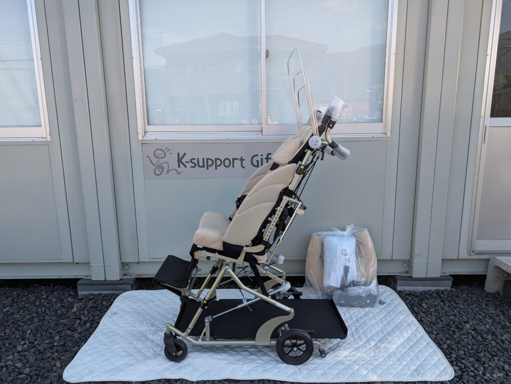 リクライニング・ティルト式手押し型のバギーで、吸引器や人工呼吸器などが搭載できる大きなユーティリティースペースを備えています。活動から休息までこれまで以上に様々な場面で使って頂けるように、リクライニングとティルトの角度範囲を増量しました。搭載スペースや押し手グリップの仕様も変更して、より使いやすく生まれ変わりました。